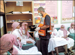 عدد من الطلاب في إحدى مدارس ضرماء يخضعون للكشف بعد تعرض المحافظة لموجة من الغبار هذه الأيام. |
