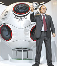 عرض الفرنسي ميشيل بلاتيني رئيس الاتحاد الأوروبي لكرة القدم (يويفا)، الكرة التي ستستخدم في نهائيات كأس الأمم الأوروبية (يورو 2008)، للمرة الأولى أمام الجماهير في العاصمة النمساوية فيينا. ومن المقرر أن تقام البطولة في النمسا وسويسرا في الفترة بين السابع و29 يونيو المقبل، وتحمل الكرة الجديدة (جلوريا) التي أنتجتها شركة (أديداس) للمستلزمات الرياضية، نفس تصميم الكرات التي تستخدم في البطولات الأوروبية. وبرغم ذلك تختلف الكرة في اللون، حيث توجد بها نقاط سوداء تحيط بها دائرة حمراء تصور كأس هنري دلوناي، وبعض الأحداث من البطولات الأوروبية السابقة. وذكرت وسائل الإعلام النمساوية أن شركة (أديداس) أعلنت اليوم أيضا أن الفريق الفائز بلقب يورو 2008 سيحق له خوض مبارياته بالكرة الجديدة حتى موعد انطلاق يورو 2012 ببولندا وأوكرانيا.