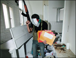 في ظل الفوضى الناجمة عن سيطرة حزب الله يبدو هذا المسلح حاملاً سلاحاً رشاشاً وهو (يسرق) ملفات ربما مهمة من مكاتب صحيفة المستقبل المؤيدة للحكومة اللبنانية . * أ.ف. ب |