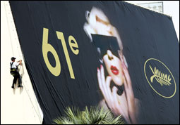 عامل صيانة يقوم بتثبيت ملصق رسمي كبير لمهرجان كان السينمائي الحادي والستين المزمع إقامته ما بين (14- 25) من شهر مايو الجاري.*رويترز |