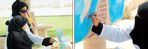تشكيليات سعوديات يقمن برسم لوحات تشكيلية جمالية لمقاعد إحدى الحدائق بمحافظة القطيف بالمنطقة الشرقية استعداداً لفصل الصيف * رويترز |