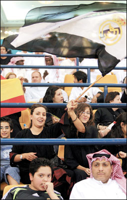 مجموعة من المشجعات الإسبانيات حضرن المباراة الودية بين نادي النصر السعودي ونادي ريال مدريد الإسباني في حفل اعتزال النجم السعودي ماجد عبدالله في استاد الملك فهد الدولي بالعاصمة الرياض حيث انتهى اللقاء بفوز النصر السعودي بأربعة أهداف قابلها هدف يتيم للنادي الملكي الإسباني. *رويترز |