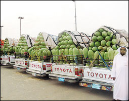 كما قامت (الجزيرة) بجولة في سوق الحبحب بوادي الدواسر وقد بلغ عدد السيارات التي تفد إلى السوق يومياً قرابة 1000 سيارة زنة طن ونصف الطن تقريباً.. ومن المتوقع أن يتجاوز ذلك بكثير خلال الأيام القليلة القادمة بخلاف السيارات الكبيرة التي تنطلق مباشرة من الحقول إلى الأسواق في كافة أرجاء المملكة والدول المجاورة.