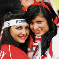مشجعتان تركيتان خلال حضورهما مباراة منتخبهما الوطني ضد منتخب الأروغواي في مباراة ودية بمدينة بوخوم الألمانية في إطار استعدادات المنتخب التركي لمشواره في نهائيات كأس الأمم الأوروبية لكرة القدم (يورو 2008)، التي تقام الشهر المقبل بالنمسا وسويسرا، وخسرت تركيا بثلاثة أهداف لهدفين. ] رويترز ...>>>... | |
