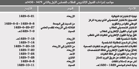 وأضاف الدكتور السلمان بأن مواعيد القبول للطلاب في الجامعة ستكون وفق الجدول الآتي.