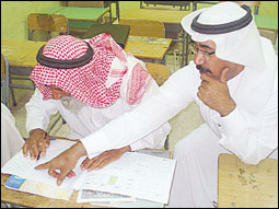 مدير عام التربية والتعليم بمنطقة حائل الدكتور محمد العاصم يساعد أحد المسنين على الإجابة ضمن برنامج (مجتمع بلا أمية) |