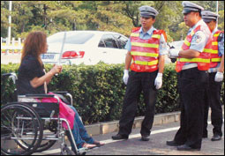 معاقة صينية تحمل سيفاً محاولة الانتحار قرب دائرة حكومية في بيجين بينما عدد من رجال الشرطة يقفون بالقرب منها استعداداً للسيطرة عليها بعد المفاوضات معها حول مطالبها التي لم يعرف ما هي أو ما الذي حدث معها. ]رويترز
