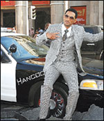 السينمائي ويل سميث يقف عند نموذج لسيارة شرطة استخدم في فيلمه الجديد (هانكوم) والذي يحتفل سميث وفريق عمل الفيلم ببدء عروضه في السينما الأمريكية * رويترز |