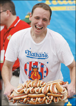 فاز الأمريكي المدافع عن لقبه جوي شيستنوت بمسابقة تناول شطائر الهوت دوج (النقانق) الشهيرة والتي تقيمها شركة ناثانس يوم الجمعة بتناوله 64 شطيرة هوت دوج في مسابقة امتدت لوقت إضافي لأول مرة في تاريخها. |