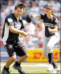 الشخصية التلفزيونية ماريا مينونوس تطارد ضاحكة الممثل بيلي بالدوين بعد أن نزعت قبعته أثناء مباراة للبيسيبول كان أبطالها هذه المرة مجموعة من المشاهير في السينما والتلفزيون الأمريكي. |