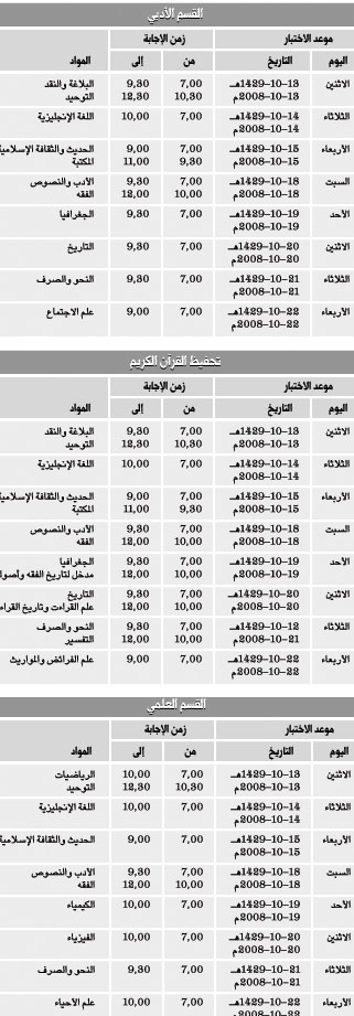 اعتمد سمو نائب وزير التربية والتعليم لتعليم البنات الأمير الدكتور خالد بن عبدالله بن مقرن آل سعود جداول اختبارات شهادة الثانوية العامة بقسميها العلمي والأدبي وثانوية تحفيظ القرآن الكريم للدور الثاني للعام الدراسي 1428-1429هـ.