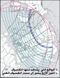 نصف سكان المملكة سيشاهدون يوم الجمعة القادم أول وآخر كسوف للشمس يحدث هذا العام؛ حيث سيشاهد الكسوف في السعودية بشكل جزئي كما في أوروبا وآسيا وكندا. وأوضح الدكتور عبد الله المسند، عضو هيئة التدريس بقسم الجغرافيا بجامعة القصيم الباحث في شؤون الفلك والمناخ، أن الكسوف سيبدأ عند الساعة 01:55 ظهراً، ويتقدم كلما اتجهنا شرق المملكة، بينما يبلغ ذروته عند الساعة 02:20، وسينتهي الساعة 02:46 ظهراً؛ حيث ستبلغ مدته حوالي 46 دقيقة. مشيراً إلى أن المتابع في المملكة سيشاهد جزءاً من قرص القمر يحجب أعلى يمين قرص الشمس. علماً بأن الجزء المنكسف فوق أراضي السعودية قليل جداً، وتتراوح نسبته من 1% إلى أقل من 20% حسب الموقع الجغرافي، وتقل النسبة كلما اتجهنا إلى الغرب حتى تصل إلى صفر%. وأكد د. المسند أن الكسوف سيشاهد أولاً في أقصى المنطقة الشمالية (عرعر ورفحاء) ثم الشمال الشرقي (حفر الباطن)، يلي ذلك المنطقة الشرقية والوسطى، ولن يشاهد في مكة المكرمة والمدينة المنورة والغربية والجنوب الغربي. يشار إلى أن مخروط ظل القمر الذي يمثل الكسوف الكليTotal eclipse سيتحرك من الغرب إلى الشرق؛ حيث يبدأ من شرق كندا مروراً بجزيرة جرينلند فالدائرة القطبية ومن ثم وسط روسيا ومنغوليا وأخيراً ينتهي الكسوف الكلي في الصين. وعرض الكسوف الكلي 237 كم ومدته دقيقتان و27 ثانية.
