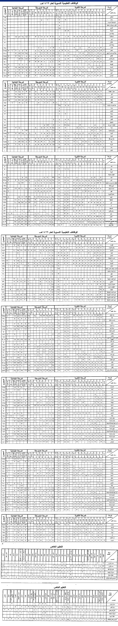 أعلنت وزارة الخدمة المدنية بالتعاون مع وزارة التربية والتعليم (تعليم البنات) عن الوظائف التعليمية للنساء التي طلبت وزارة التربية والتعليم - تعليم البنات إشغالها وعددها (17.217) وظيفة تعليمية شاغرة في مجالات التعليم العام والتربية الخاصة ومحضرات المختبرات المدرسية، وذلك في التخصصات الموضحة حسب الجداول المرفقة، وذلك وفقاً للتوزيع الوارد من شئون تعليم البنات من حيث المقر والتخصص والمرحلة، وسيتم شغل هذه الوظائف وما يرد مستقبلاً من وزارة التربية والتعليم تعليم البنات من وظائف مماثلة، وذلك حسب معايير المفاضلة (المحددة عناصرها على موقع الوزارة على الإنترنت) بين الخريجات اللاتي سبق أن تقدمن على موقع الوزارة على الإنترنت خلال الفترة من 3-6-1429هـ حتى 8-7-1429هـ من حاملات المؤهلات المناسبة للتعليم التي تضمنها الإعلان الصادر بتاريخ 3-6-1429هـ في الصحف المحلية وعلى موقع الوزارة بالإنترنت.