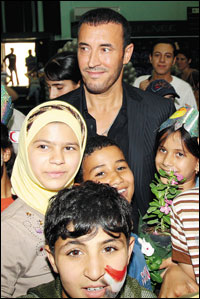 الفنان العراقي كاظم الساهر يقف بين مجموعة من الأطفال أثناء زيارته لملجأ للأطفال العراقيين في العاصمة السورية دمشق. * ا.ف.ب |