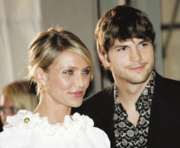 الممثلة الأمريكية كاميرون دياز والممثل الأمريكي آشتون كتشر في استقبالهم لرئيس وزراء اليابان الذي قرر حضور عرض فيلمهم الأخير What Happens in Vegas في العاصمة اليابانية طوكيو. أ.ف.ب