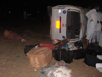 توفي مقيم بنغلاديشي وأصيب 10 طلاب ومشرفين من حملة تحفيظ القرآن الكريم بالرياض اثر تعرض الحافلة (الميكروباص) التي كانت تقلهم أمس الأول لحادث انقلاب على طريق الرياض- الطائف.. حيث كان الطلاب والمشرفون والسائق البنغلاديشي عائدين من الرحلة الطلابية التي تم خلالها أداء العمرة والاصطياف بالطائف لمدة 3 أيام ولدى اقتراب الحافلة من مركز ظلم ادى انفجار اطارها لانقلابها عدة مرات مما أسفر عن وفاة السائق واصابة 3 مشرفين و7 طلاب باصابات متفرقة منها 3 حالات خطيرة ليتم نقلهم على الفور لمركز صحي ظلم عن طريق الهلال الاحمر واسعافات المراكز الصحية في ظلم والمويه وبعد إجراء الاسعافات الاولية لهم تم تحويلهم لمستشفى عفيف العام وادخلوا لأقسام التنويم والعناية المركزة.