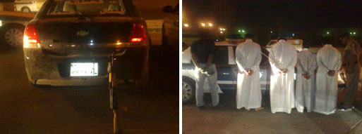 حيث عثر بحوزتهم على سلاح نوع رشاش وعدد خمس طلقات رشاش حية وثلاث طلقات مستخدمة ومخزن رصاص رشاش فارغ حيث تم الاتصال بصاحب السيارة وسائقة للحضور للتعرف على الجناة واستلام سيارته وتم تسليم الجناة لمركز شرطة الحمراء لاستكمال التحقيق معهم الذي لا يزال جارياً وإحالتهم للقضاء لإصدار الحكم الشرعي بحقهم.