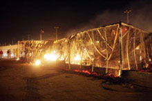احترق أحد مخيمات مهرجان النخلة والتمور بمحافظة رياض الخبراء وأوضح ل(الجزيرة) الناطق الإعلامي للدفاع المدني بالقصيم النقيب جلوي الحربي أنه باشرت فرق الإطفاء في إدارة الدفاع المدني برياض الخبراء فجر أمس حادث حريق في سوق التمور بمحافظة رياض الخبراء وهو عبارة عن احتراق عريش مقام من الحديد وعسيب النخل تعود ملكيته للبلدية ويحتوي على ثلاجة ومكيفين صحراويين وبعض الأثاث والأسلاك الكهربائية حيث تم إخماد الحريق والسيطرة علي قبل انتشاره وقد نتج عن الحادث بعض الخسائر المادية فقط وتشير المعاينة الأولية للحادث أن السبب هو التماس كهربائي.