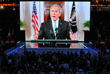 واذا كان جورج بوش غائباً عن سانت بول فإن أوساطه كانت حاضرة بالكامل تقريباً في اكسيل سنتر. فقد دافعت لورا بوش السيدة الأمريكية الأولى عن أداء زوجها فيما حضر إلى المنصة والده الرئيس السابق جورج بوش وزوجته باربرة ووقفا إلى جانب سيندي ماكين زوجة المرشح الجمهوري وروبرتا ماكين (96 عاماً) والدته. وقال بوش وسط تصفيق المندوبين الجمهوريين (نعيش في عالم خطر .. ونحن بحاجة لرئيس يفهم دروس 11 أيلول - سبتمبر 2001، وبأنه من أجل حماية أميركا يتوجب علينا أن نبقى على أهبة الاستعداد وأن نمنع الاعتداءات قبل حصولها وألا ننتظر كي نتعرض للضرب مجدداً .. مضيفاً أن الرجل الذي نحن بحاجة إليه هو جون ماكين). ورد فريق المرشح الديموقراطي باراك اوباما (هذا المساء سلم جورج بوش المهمة بحماسة إلى الرجل الذي يعتزم مواصلة سياسته في السنوات الأربع المقبلة). وقال ديفيد بلوف مدير حملة اوباما (الرجل الذي هو بحاجة إليه جورج بوش قد يكون ماكين لكن التغيير الذي تحتاجه أميركا يجسِّده باراك اوباما). من جهة أخرى جاء جو ليبرمان الذي كان مرشحاً قبل ثماني سنوات لمنصب نائب الرئيس خلال حملة آل غور عام 2000 في مواجهة جورج بوش وديك تشيني، لدعم (صديقه) جون ماكين قاطعاً كل العلاقات مع أوساطه السياسية الديموقراطية. وقال ليبرمان (لماذا يحضر ديموقراطي مثلي مؤتمراً للحزب الجمهوري؟ الجواب سهل، إنني موجود هنا هذا المساء لدعم جون ماكين لأن البلاد تتجاوز الحزب).