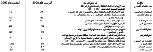 ترتيب المملكة وفقاً لكل مؤشر في تقرير ممارسة أنشطة الأعمال الصادر من البنك الدولي/ مؤسسة التمويل الدولية عامي 2006 و2007
