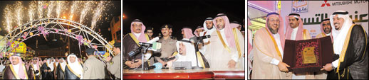 بعد ذلك كلمة للرعاة ليعقب ذلك تكريم الرعاة والمشاركين في المهرجان إلى أن انطلقت المسيرة الشبابية بأكثر من مائة سيارة من نوع هايلوكس يقودها شباب عنيزة والذين مروا من أمام سموه حاملين رايات الوطن حيث انطلقوا من عصر أمس الأربعاء إلى مداخل منطقة القصيم لتوزيع التمور مجاناً على ضيوف المنطقة.