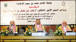 رعى صاحب السمو الأمير الدكتور بندر بن سلمان بن محمد آل سعود مستشار خادم الحرمين الشريفين رئيس لجنة الدعوة في أفريقيا مساء أمس الأول حفل افتتاح أعمال الملتقى السابع عشر للجنة الدعوة في أفريقيا الذي تستضيفه جامعة الإمام محمد بن سعود الإسلامية، وذلك بحضور معالي مدير الجامعة الدكتور سليمان بن عبدالله أبا الخيل، ووكلاء الجامعة. ورحب معالي الدكتور سليمان أبا الخيل بضيوف الملتقى وقال: "إنها فرصة سعيدة أن نلتقي يا صاحب السمو ومع هذه الثلة المباركة من طلاب العلم والدعاة في صرح من صروح العلم.