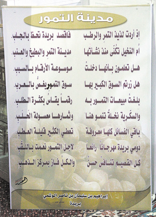 أبدع الشاعر إبراهيم بن سليمان بن ناصر الوشمي في رسم لوحة شعرية رائعة عبر أبياته الجميلة التي جسدت واقع سوق مدينة التمور بريدة والذي يعد الأبرز على مستوى العالم من حيث كميات التمور وتميزها إضافة إلى القوة الشرائية التي تؤكد مكانته الاقتصادية.