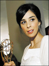 الملحنة والشاعرة سارة سلفرمن تحمل جائزة ايمي لأفضل لحن وقصائد التي حصلت عليها عن أغنية - Im ing Matt Damon * رويترز |