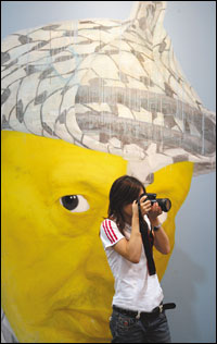 زائرة صينية تقف أمام صورة للرئيس الفلسطيني الراحل ياسر عرفات في معرض الفن المعاصر الدولي المقام في شنغهاي الصينية. * (أ. ف. ب) |