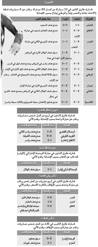تكثر في كل أرجاء العالم ملاحقة النجوم؛ ففي إيطاليا يتحدثون عن النجوم البرازيليين مثل كاكا ورونالدينهو أكثر مما قد يراه البعض أهم من ذلك؛ فقد جعلوا 2 كجم وزنا زائدا لرونالدينهو قضية القضايا، وفي إنجلترا جعلوا من الموقف الذي اعترض كريستيانو رونالدو عندما تسبب في طرد روني في المونديال أهم خبر على صدر الصفحات الرياضية، ولدينا غياب طارق التايب عن أولى مباريات الهلال في الموسم أمام الفريق الصاعد للتو للدوري الممتاز أبها هي قضية القضايا، ويحق للصحافة أن تكتب عن هذا اللاعب كونه نجماً كبيراً يستحق أن يأخذ كل هذه المساحة من الاهتمام والضوء، ولكن ما يفترض على الصحافة ألا تتجاهله هو أن هذا اللاعب الذي حولوا غيابه اليسير إلى (لزمه) يلاحقونه بها يجب أن ننصفه من خلال لغة العصر وهي لغة الأرقام التي نسردها عليكم من خلال هذا التقرير الجميل الذي ساعدنا فيه العضو الهلالي سعود العيسى، وإليكم الإحصائية: