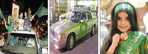 في ليلة ارتسمت فيها لوحات الفرحة على وجوه الصغار والكبار بريشة الحب للوطن والولاء للقيادة وبأساليب متنوعة. قضى أفواج كبيرة من المواطنين أمس الثلاثاء ليلتهم يجوبون شوارع العاصمة بين راكب لسياراته ودراجته النارية والهوائية وبين متزلج على (الإسكوتر) وسائر على الأقدام متوشحين ورافعين راية التوحيد وصور قائد المسيرة خادم الحرمين الشريفين الملك عبدالله بن عبدالعزيز وسمو ولي عهده الأمين صاحب السمو الملكي الأمير سلطان بن عبدالعزيز رعاهما الله ومرددين هتافات تعبر عن هذا الحب في تمازج وتناغم أخوي كعادة أبناء هذا الوطن تجاه الوطن والقيادة، وفي جو يسوده الأمن والأمان والمحبة، هذا وقد واصلت هذه الأعداد الكبيرة التعبير عن فرحتها إلى وقت السحور حيث اضطرالكثيرين منهم لتناول وجبة سحورهم في فنادق ومطاعم ومقاهي العاصمة التي غصت بهم.