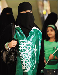 امراة سعودية تتوشح العلم السعودي الأخضر فوق عباءتها السوداء مساء أمس الأول...>>>... |