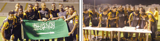 احتفل الفريق الكروي الأول بنادي الاتحاد مساء أمس باليوم الوطني 78 للمملكة، حيث قام اللاعبون بتقطيع الكعكة التي تم إعدادها بهذه المناسبة الغالية ورفع أعلام الوطن عالياً بمشاركة أعضاء الجهازين الإداري والفني وبعد هذه الاحتفالية انطلقت التدريبات التي شهدت قبل انطلاقتها اجتماع مدرب الفريق الأرجنتيني كالديرون باللاعبين، حيث طالبهم خلال الاجتماع بمضاعفة الجهد خلال المرحلة المقبلة كما طالبهم أيضاً بالانضباط في التدريبات. وبعد الاجتماع انطلق المران الذي شهد مشاركة المدافع أسامة المولد العائد من الإصابة بالإضافة إلى قائد الفريق محمد نور الذي غاب عن التدريبات الماضية بسبب إصابته في الظهر إلا أنه شارك زملاءه اللاعبين بفاعلية خلال مران الأمس. وفي نفس السياق تأكد أن يخوض الفريق مناورة كروية اليوم الخميس أمام الأولمبي، حيث يرغب المدرب من هذه المناورة في كشف بعض اللاعبين الشباب الذين انضموا حديثاً إلى صفوف الأولمبي.