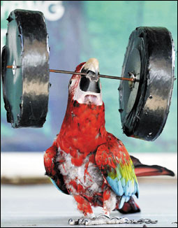 ببغاء يؤدي حركات بهلوانية في حديقة حيوان بشين ياق الصينية حاملاً أثقالاً في حملة تقوم بها المحافظة لجذب ملايين الصينيين في عطلة نهارية أسبوعية تمتاز |