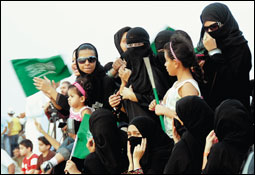 سعوديات يلوحن بالعلم لتشجيع المتسابقين السعوديين المشاركين في سباق الجيت سكي المقام على شواطئ مدينة جدة. * ا.ف.ب |