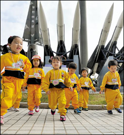 أطفال كوريون يلعبون بالقرب من مجسم لقاعدة صواريخ |
