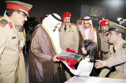 طفلة تقدم هدية لولي العهد أثناء افتتاحه معرض درع الوطن بالشرقية أمس الأول |