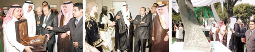 وعقب وصولهم مقر المعرض قاموا بقص الشريط إيذانا بافتتاح المعرض ثم تجولوا فيه واطلعوا على ما يحتويه من أزياء وتراث لمناطق المملكة وصور ضوئية ولوحات رسم واستمعوا إلى شرح من الرسام السعودي حسان البنجابي عن عدد اللوحات المعروضة في المعرض التي رسمها وتمثل تراث عدد من مناطق المملكة.