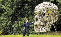 طفل يقف أمام مجسم على شكل جمجمة صنع من الأدوات المنزلية وعرض أمس في لندن. |