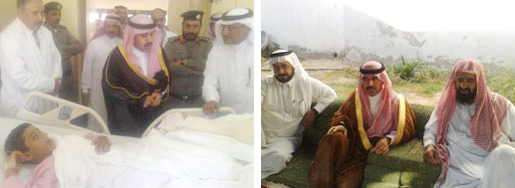 قام وكيل محافظة القريات الدكتور عبدالله بن غازي المريخان بنقل تعازي ومواساة صاحب السمو الملكي الأمير فهد بن بدر بن عبدالعزيز أمير منطقة الجوف لوالد الأشقاء الثلاثة محمد بن لويفي الشراري الذين لقوا مصرعهم أثر حادث دهس تعرضوا له أثناء خروجهم من المدرسة، الذي بدوره حمد الله عز وجل على قضاء الله وقدره وقال إن المؤمن مبتلى وما وفاة أبنائي الثلاثة في حادث دهس مروع إلا امتحان من رب العالمين ليس أمامنا نحن إلا نؤمن بقضائه سرا وعلانية ونسأل الله أن يخلفنا في مصيبتنا وأثنى على ما قدمه أمير منطقة الجوف من تعازي ومواساة وقال بأن ذلك ليس بمستغرب على ولاة الأمر حفظهم الله.. وفي التفاصيل تعرض تسعة من أبناء محمد بن لويفي الشراري إلى حادث دهس من شاب كان يقود سيارة من نوع جيب لاندوز بسرعة جنونية والذي فقد السيطرة على سيارته عندما انحرف صهريج نقل مياه بنفس المسار الذي كانا يسيران عليه مما جعله يقفز بسيارته الجزيرة الوسطية متفاديا الصهريج إلا أن قدرة المولى عز وجل شاءت بوجود الأشقاء التسعة ومعهم زميلان لهم قد انصرفوا من المدرسة ويسيرون على الرصيف من الجهة المقابلة لتصطدم بهم السيارة الجيب ويلقى ثلاثة أشقاء منهم مصرعهم على الفور وينقل الثمانية الآخرون إلى مستشفى القريات العام ليتلقوا العلاج اللازم حيث تعرض بعضهم لكسور متفرقة والبعض إلى جروح ورضوض وكدامات وقد اطمأن على صحتهم ساعة وقوع الحادث وكيل محافظة القريات الدكتور عبدالله المريخان ومدير مرور القريات العقيد سعود العجلان ومدير صحة القريات احمد العلي كما زار الطلاب بالمستشفى مدير التربية والتعليم للبنين الدكتور مرزوق بن ملفي الخنجر ونقل لوالدهم تعازي ومواساة معالي وزير التربية والتعليم.