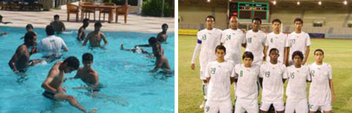 أجرى منتخبنا للشباب صباح أمس تدريبات خاصة داخل مسبح فندق إقامة المنتخب كجرعة تدريبية يفرضها المدرب بعد كل مباراة للمنتخب وجاءت حصة التدريب بإشراف المدرب ماركوس مدرب اللياقة البدنية للمنتخب وبمشاركة المدرب نيلسون الذي تواجد مع اللاعبين بالمسبح، وجاء هذا التدريب من حيث الجري الخفيف داخل الماء مع عمل إطالة للعضلات واستمرت حصة التدريب قرابة الساعة بمشاركة جميع اللاعبين ماعدا اللاعبين أحمد الزعاق الذي خضع إلى فحوصات طبية دقيقه صباح أمس بسبب شعوره بإصابة طفيفة في المناورة ليوم أمس الأول أمام فريق مضر الكروي وهي الإصابة التي أقلقلت الجهاز الفني والإداري نظرا لما يشكله اللاعب من عنصر مهم لخريطة المنتخب كمهاجم أساسي وقناص وسريع وهي الإصابة التي اشتكى منها بمعسكر ومباريات الدورة الدولية في أبو ظبي بعد المباراة الأولى أمام المغرب وتم الشفاء منها وعاد وشارك زملاءه في التدريبات اليومية كما هي المباراة التجريبية أمام مضر ليتواجد صباح أمس بأحد المستشفيات لإجراء الفحوصات النهائية على إصابته التي أجرى أشعة مقطعية ستحدد ننتائجه اليوم مما اضطر المدرب نيلسون إلى تأجيل موعد استبعاد الثلاثة اللاعبين إلى وقت آخر، كما لم يشارك اللاعب وليد المطيري الذي هو الآخر خضع إلى تدريب خاص مع المدرب ريكاردو بصالة الحديد وخصص له الجري الخفيف على سير الجري ليمنح بعدها المدرب جولة حرة لفترة الظهر والمساء لجميع اللاعبين وتكون في ربوع المنطقة الشرقية جاءت عودتهم للمعسكر عند الساعة العاشرة ليلا من نفس اليوم وسيعود نيلسون هذا المساء إلى مواصلة التدريبات على مدينة الأمير سعود بن جلوي الرياضية بالراكة..