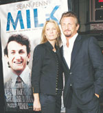 الممثل العالمي شون بين يقف أمام ملصق إعلاني لفيلمه الجديد Milk وإلى جانبه تقف زوجته الممثلة روبن رايت بين في ليلة افتتاح الفيلم على مسرح كاسترو بسان فرانسيسكو. |