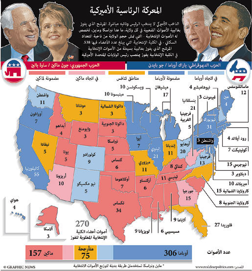 كشف استطلاع لرويترز وسي-سبان ومعهد زغبي نشر أمس الأربعاء أن باراك أوباما المرشح الديمقراطي لانتخابات الرئاسة الأمريكية متقدم بفارق خمس نقاط على منافسه الجمهوري جون ماكين في الأسبوع الأخير من حملة الانتخابات الأمريكية. وأظهر الاستطلاع التتابعي لمدة ثلاثة أيام والذي يجري على مستوى البلاد أن نسبة التأييد لأوباما بين الناخبين المحتملين بلغت 49 في المئة مقابل 44 في المئة لماكين في تحسن مقداره نقطة واحدة لأوباما عن يوم الثلاثاء حينما كان متقدماً أربع نقاط. ويجري الاستطلاع هاتفياً ويصل هامش الخطأ فيه إلى 2.9 نقطة مئوية. كما أفاد استطلاع أجراه المعهد العربي الأمريكي ونشرت نتائجه الثلاثاء أن أوباما يتفوق على ماكين بفارق 44 نقطة لدى الناخبين العرب الأمريكيين. وقال المعهد العربي الأمريكي في بيان وزعه على الصحافيين إن (أوباما حقق تقدماً جوهرياً بين الناخبين العرب الأمريكيين) منذ منتصف ايلول-سبتمبر الماضي حتى اليوم. وأضاف المعهد الذي يترأسه جيمس زغبي، والذي يعتبر أكبر منظمة تعنى بشؤون العرب الأمريكيين في الولايات المتحدة، أن ارتفاع نسبة التأييد لأوباما بين العرب الأمريكيين (ليس مفاجأة بالنظر إلى أن ثلثي العرب الأمريكيين تأثروا بالأزمة الاقتصادية) التي بدأت الشهر الماضي.