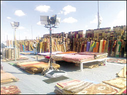 يشهد معرض المنتجات الاستهلاكية الوطنية في محافظة سكاكا بمنطقة الجوف إقبالاً كبيراً من الزوار والمتسوقين منذ افتتاحه في 22 من الشهر الماضي، بخاصة من سكان المنطقة والقرى التابعة لها، وقد تجولت (الجزيرة) في أروقة المعرض الذي يشارك فيه ما يربو على 100 شركة ومحل من داخل وخارج منطقة الجوف بتكلفة إجمالية تبلغ ثلاثة ملايين ريال ونصفاً، حيث تتخذ المحال التجارية أقساماً جانبية تتنوع فيها البضائع والمستلزمات منها الملابس النسائية والأطفال والإكسسوارات والأدوات الكهربائية والمحامص والمكتبات ومحال العطارة وألعاب الأطفال والتسجيلات، إضافة إلى أكشاك الأكلات السريعة حول البوابة الرئيسة للمعرض، كما توجد بعض الأقسام في فناء المعرض الخارجي مثل المفروشات والسجاد ومحال البضائع المخفضة وأقسام بيع الساعات والمنظفات.