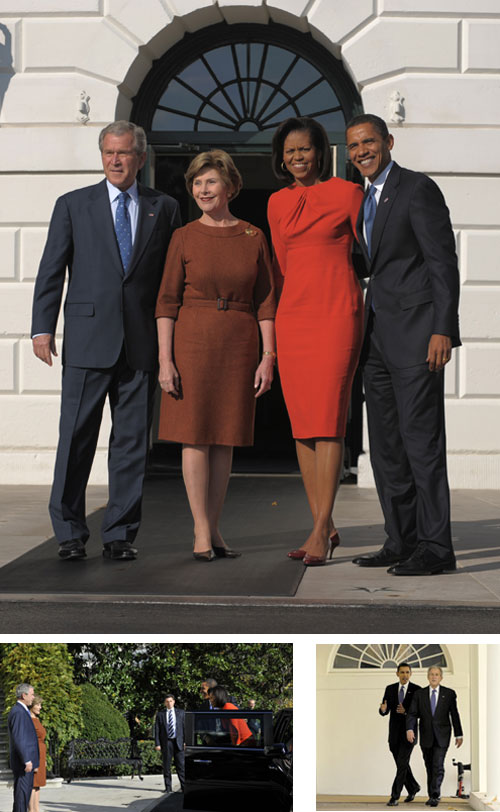 ووصل أوباما إلى البيت الأبيض ترافقه وزوجته ميشال التي ستصبح السيدة الأولى بعد تسلم زوجها السلطة في 20 يناير.واستقبل بوش وزوجته الرئيس المنتخب وقرينته ميشال أمام المدخل الرئيسي للبيت الأبيض لدى نزولهما من سيارة ليموزين. وتصافح بوش وأوباما في حين تبادلت لورا وميشال القبلات. وبعد دقائق من السير بمحاذاة حدائق البيت الابيض، دخل بوش وأوباما إلى المكتب البيضاوي وأجريا أول مباحثات معمقة تركزت على الاقتصاد المتعثر وحربي العراق وأفغانستان والتهديدات الإرهابية.