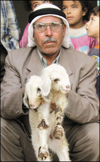 مزارع فلسطيني يمسك بخروف سيامي برأسين في مخيم اللاجئين بالضفة الغربية.* (الفرنسية) |