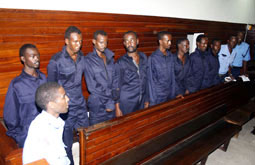 مثل ثمانية قراصنة صوماليون مشتبه بهم أمام محكمة أمس الأربعاء في مدينة مومباسا الساحلية الكينية تحت حراسة أمنية لاستجوابهم في تهم بالقرصنة. ومثل المتهمون أمام القاضي مرتين من قبل حيث دفع جميعهم بأنهم غير مذنبين، وكانت البحرية البريطانية قد سلمت القراصنة المشتبه ...>>>...