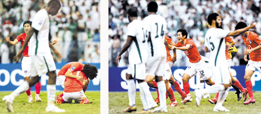 بدأ المنتخب السعودي المباراة بتشكيل متوقع لم يختلف كثيراً عن المباريات السابقة.. فلعب في المرمى وليد عبدالله وأمامه الرباعي أسامة المولد وتكر والهوساوي والزوري.. وفي الوسط لعب عزيز وأحمد عطيف والشهلوب وعبده عطيف.. وفي المقدمة نايف هزازي والسلطان.. حيث بكر منتخبنا في الاستحواذ على الكرة واللعب في الملعب الكوري منذ البداية مستفيداً من الحذر الذي بدأ به الكوريون اللقاء.. من خلال التنظيم الدفاعي وتكثيف الوسط وعودة المهاجمين أيضاً للوسط لزيادة الكثافة فيه وبالفعل نجح الكوريون في عزل الهجوم السعودي عن الوسط خصوصاً بعد الدقائق العشر الأولى وهي التي شهدت في دقيقتها الخامسة كرة سهلة للتسجيل تهيأت أمام السلطان إثر ضربة ركنية لكنه سددها في جسم المدافع الذي يقف على خط المرمى لتعود لتكر الذي بدوره (جلى) الكرة من داخل خط الستة لتهدر أهم الفرص.. رد عليها الكوريون سريعاً بعرضية أرضية مرتدة تصدى لها وليد ببراعة.. بعد ذلك عاد اللعب لينحصر في وسط الملعب مع خطورة كورية في الجهة اليسرى التي تواجد بها مهاجم مانشستر يونايتد بارك سونغ والذي حول أكثر من كرة ومنها عرضية في الدقيقة 27 أكملها رأس الحربة جونق هون في يد وليد الذي كان في قمة حضوره بينما لم ينجح المنتخب السعودي في بناء هجمات واضحة واعتمد على المهارة الفردية للاعبيه للوصول لمناطق الخصم ومنها كاد الهزازي أن يصل للشباك لكن تسديدته الأرضية مرة بجوار القائم الأيسر للمرمى.. بعد 32 دقيقة لعب.. ورغم محاولة المنتخب السعودي الاستحواذ على الكرة وأخذ زمام المباراة إلا أن المنتخب الكوري كان حاضراً في وسط الميدان وكان يهدد المرمى السعودي عند كل فرصة سانحة وحيث التسرب من الأطراف الأيمن أو الأيسر وكاد شونق أن يهز الشباك هو الآخر حين واجه وليد عبدالله من ناحية اليمين، لكن وليد أيضاً أبعدها لتمر أمام المرمى سليمة.. وهكذا اتضح أن الكوريين حريصين جداً على فتح اللعب وإبعاد الخطورة عن مناطقهم ولم ينجح لاعبونا في تجاوز الحارس الكوري سوى عند تقدم الظهيرين الزوري أو أسامة واللعب على الأطراف وهي بالفعل التي شكلت الخطورة في الشوط الأول.