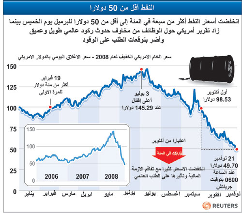 وانخفضت أسعار النفط إلى نحو 50 دولاراً للبرميل منذ سجلت في يوليو تموز الماضي مستوى قياسياً أعلى من 147 دولاراً وذلك تحت وطأة تراجع الطلب بفعل تباطؤ الاقتصاد العالمي.