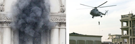 وفي محاولة لإخراج مسلحين لا يزالون يحتجزون رهائن في المركز اليهودي في مومباي فقد قامت قوات الكوماندوز الهندية صباح أمس بعمليات إنزال من على متن مروحية على سقف أحد المباني فيه وقامت المروحيات بتوفير غطاء من النيران لتمكينهم من دخول المبنى.